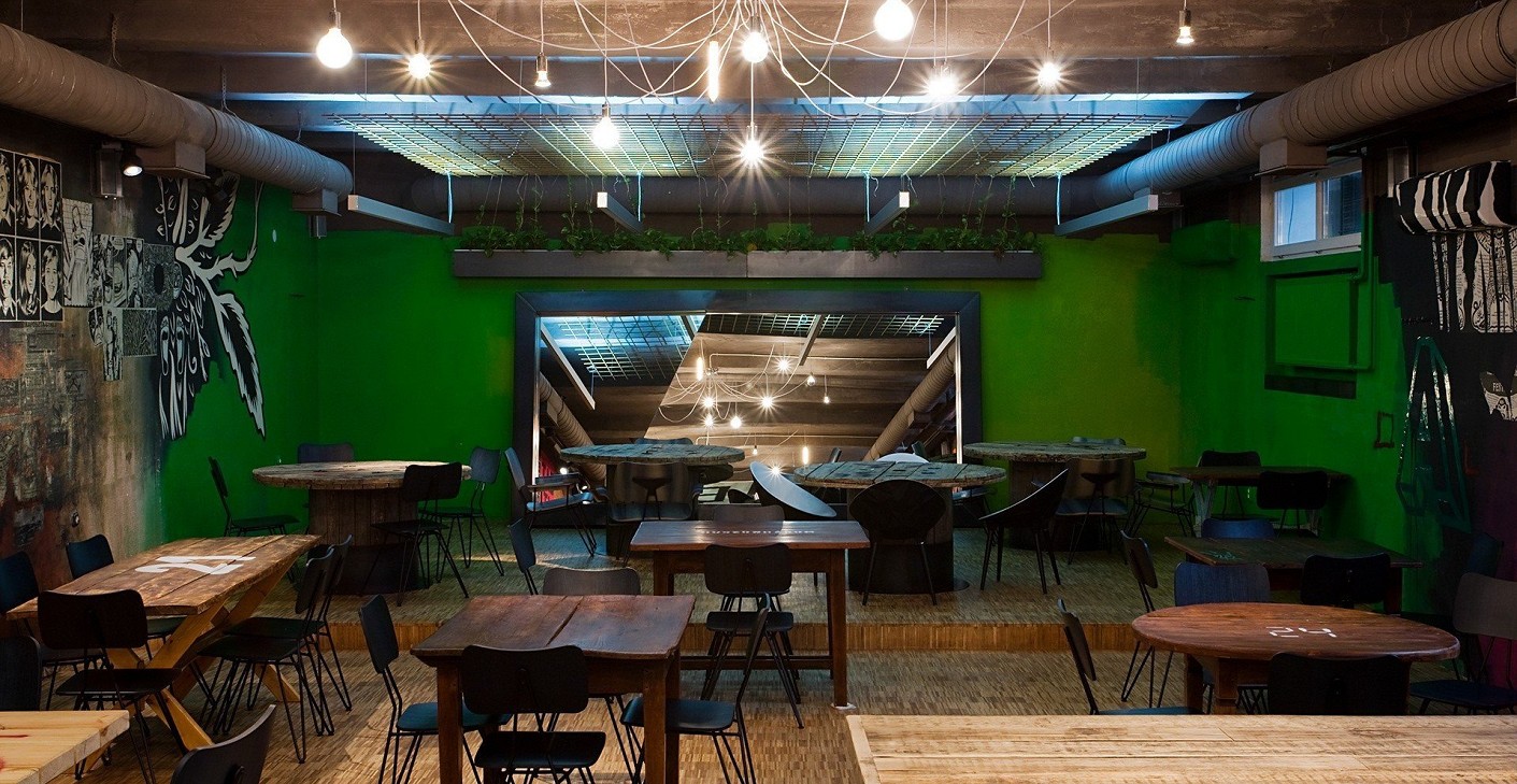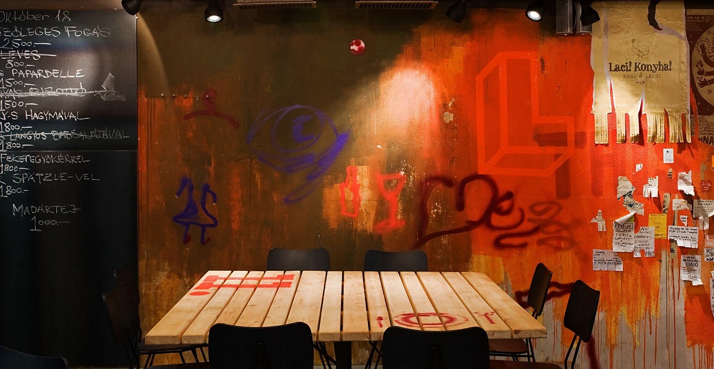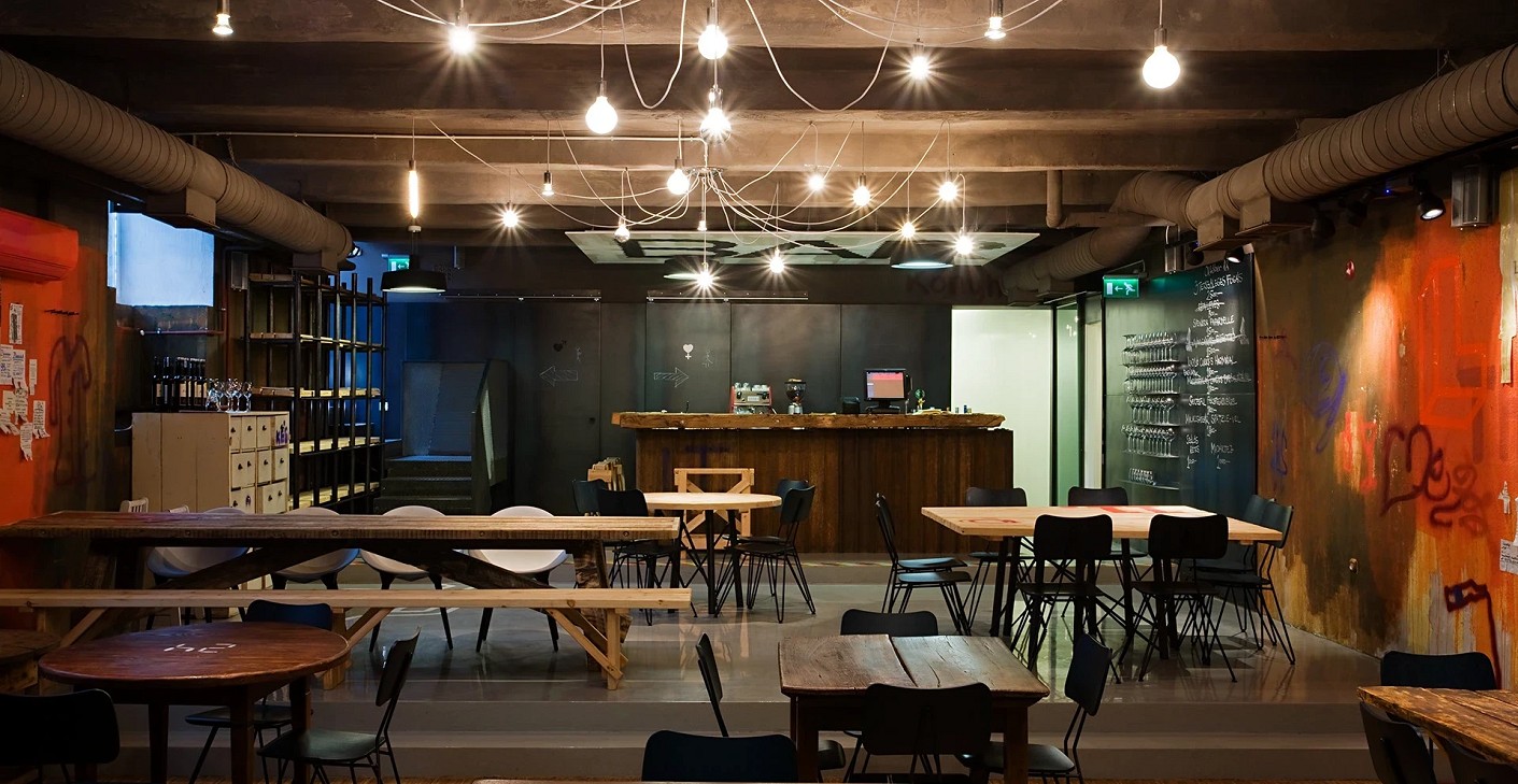 Raw steel, wooden surfaces, and vintage furniture evoke layers of the past, reinterpreted through contemporary graphic elements. The restrained presence of neutral materials provides a fitting framework for gastronomic experimentation, while the intimate zones are balanced by a spacious, open communal area, making the place both a workshop and a meeting point.