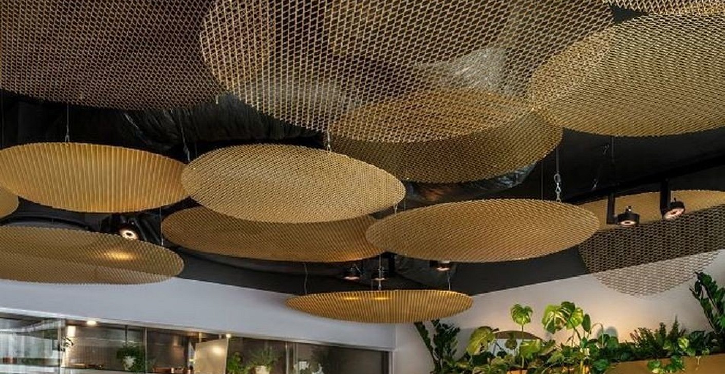 At Stand, there are no harsh lights or harsh shadows; the space is illuminated by diffused and indirect lighting. This effect is achieved, among other things, by laser-cut, circular steel mesh panels suspended from the ceiling. The light is refracted and softened on the mesh wires. Panels are placed at varying heights, making the low ceiling almost imperceptible. The mesh panels of varying thickness and density can evoke numerous associations for visitors. Fónagy and Bihary aimed to create lighting reminiscent of natural settings, where sharp shadows are rare. Notably, the environmentally conscious copper-toned steel panels strongly reference copper, a material often used in gastronomic spaces.