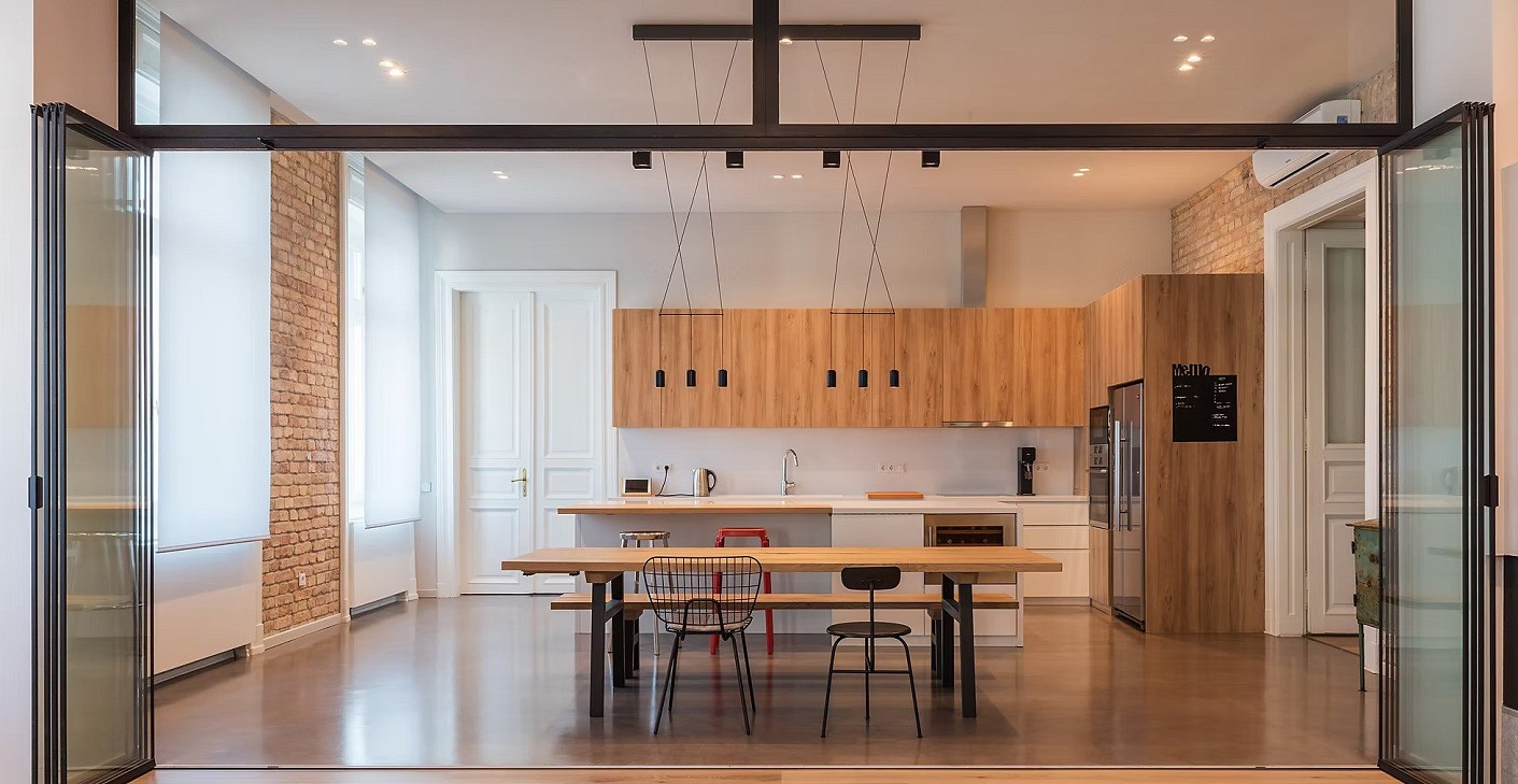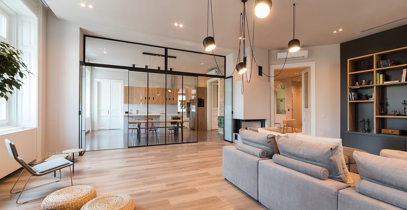 Egy belvárosi saroklakás újraszervezése izgalmas térkapcsolatok és korszerű családi élettér kialakítását tette lehetővé.